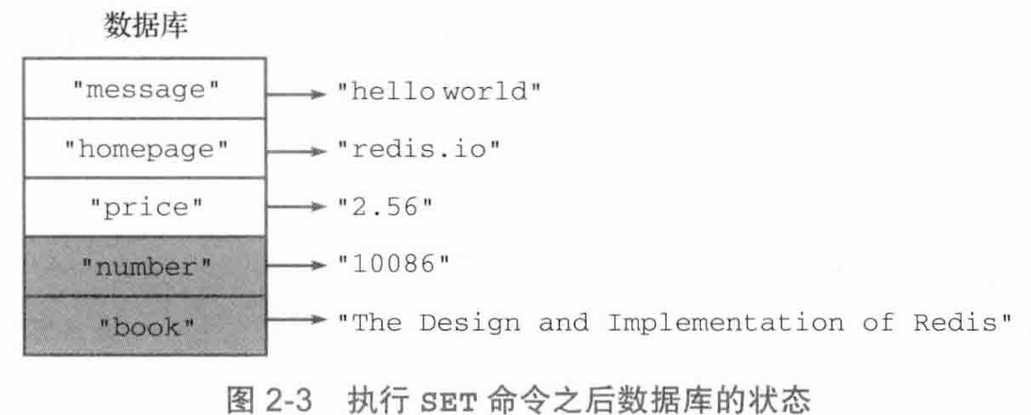 SET number "10086"即可创建键为“number”、值为“10086”的字符串键。又如,通过SET book "The Design and Implementation of Redis"可创建键为“book”、值为书名全称的字符串键。这些操作会改变数据库中键值对的存储状态,如图示中通过执行前后对比可直观展示其变化。
