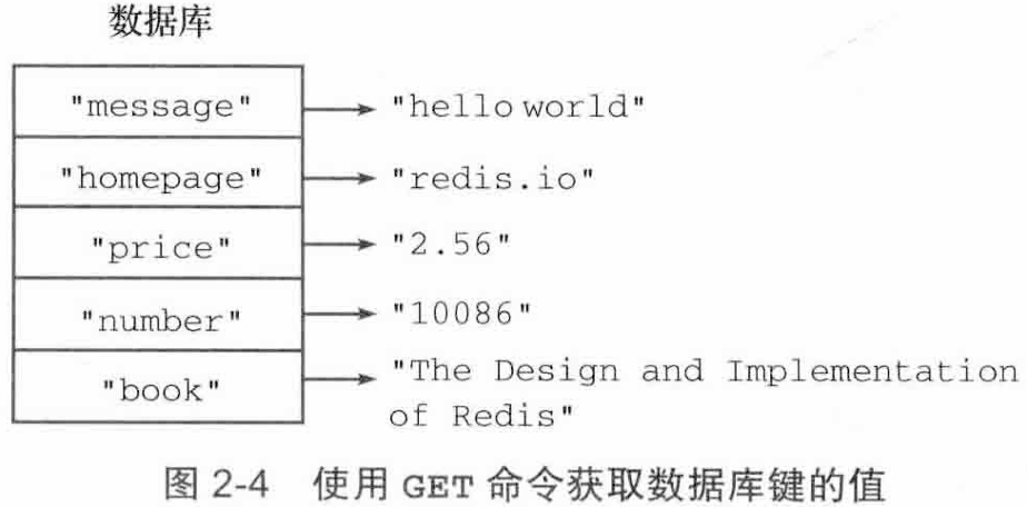 GET key。例如,对于包含message、number和homepage键的数据库,执行GET message返回"hello world",GET number返回"10086",GET homepage返回"redis.io"。若指定的键在数据库中无对应值,GET 命令将返回空值(nil)。例如执行
