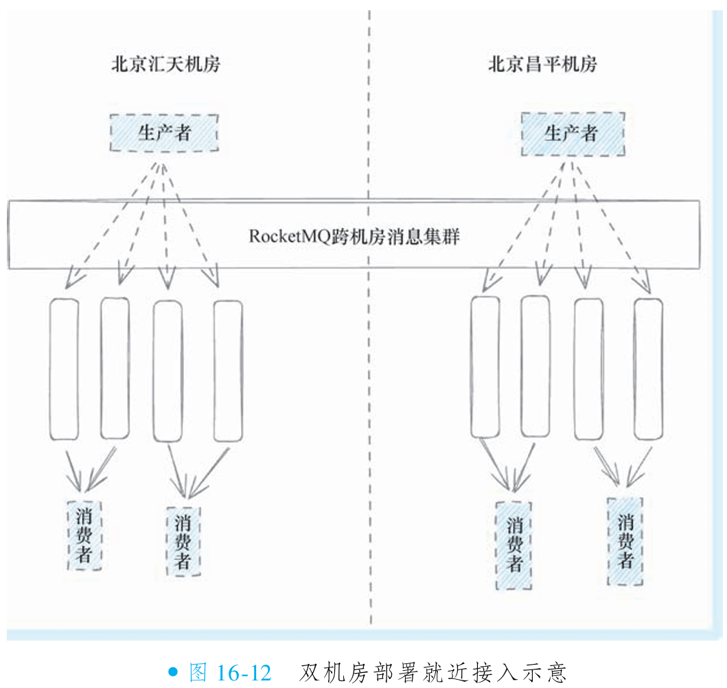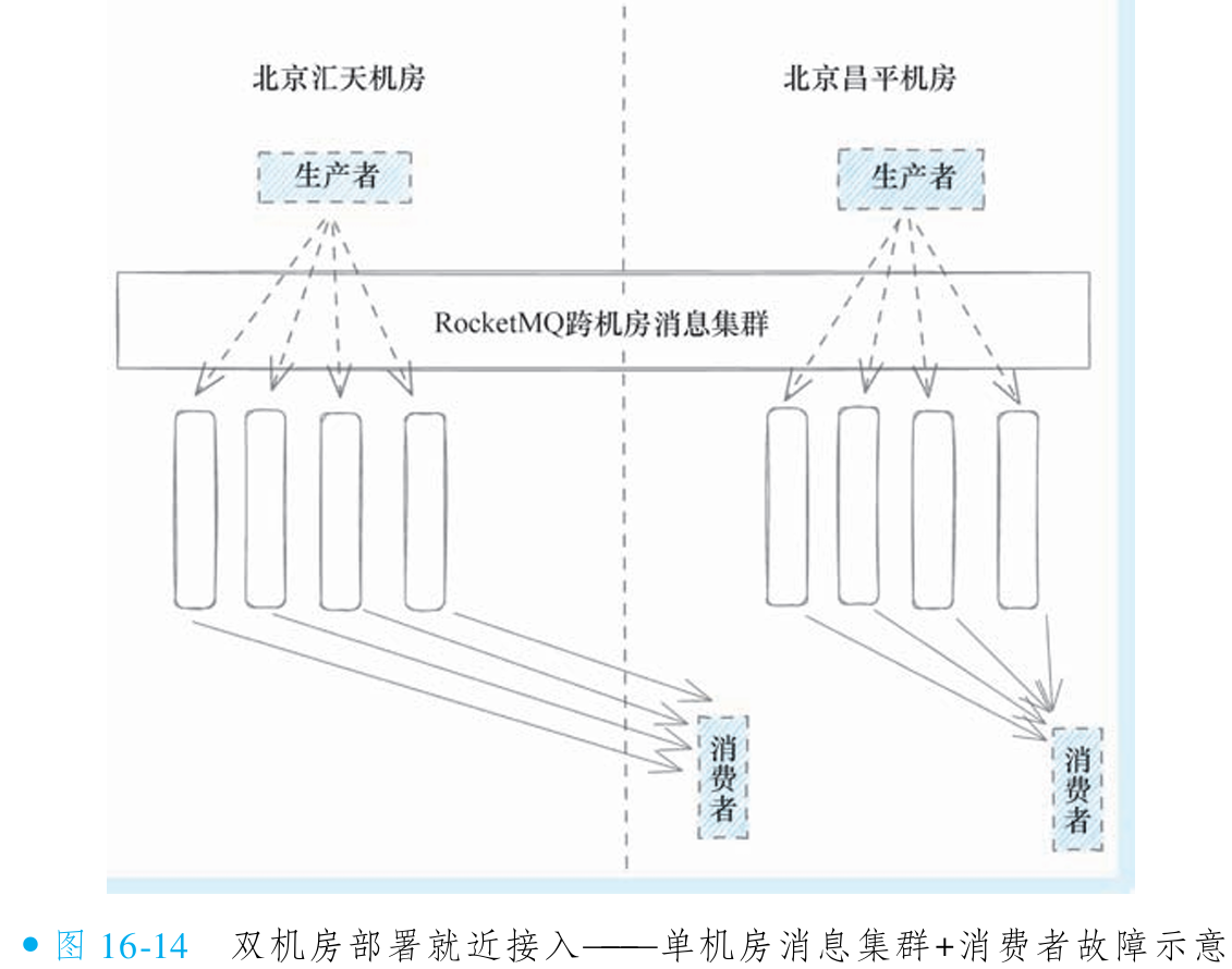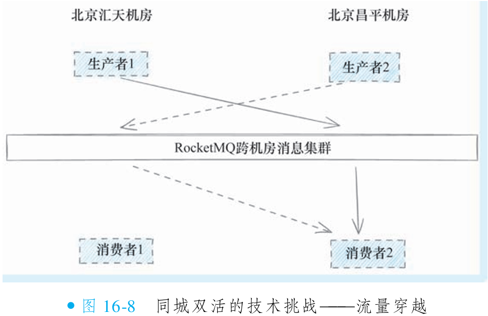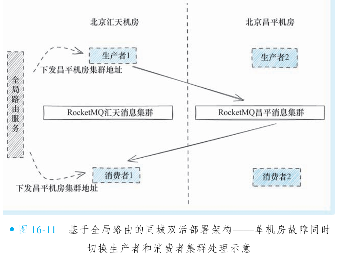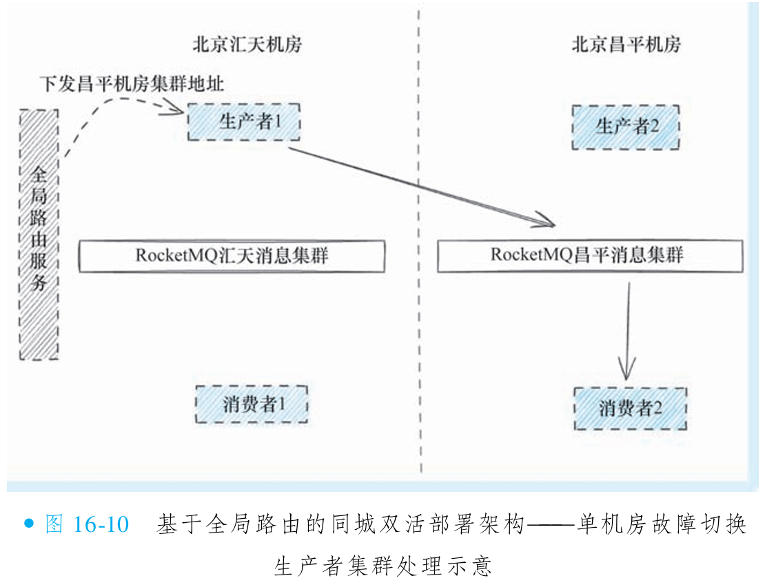 在如图16-10所示的架构切换场景中,若将消费压力全量导向昌平机房,需确保其容量足以承载两机房流量,否则需同步切换消费者。切换时,全局路由服务将下发昌平机房Name Server地址,汇天机房消费者据此新建连接至新集群,实现消息流重构:汇天生产者投递至昌平MQ集群,双机房消费者共同分摊消费(如图16-11)。