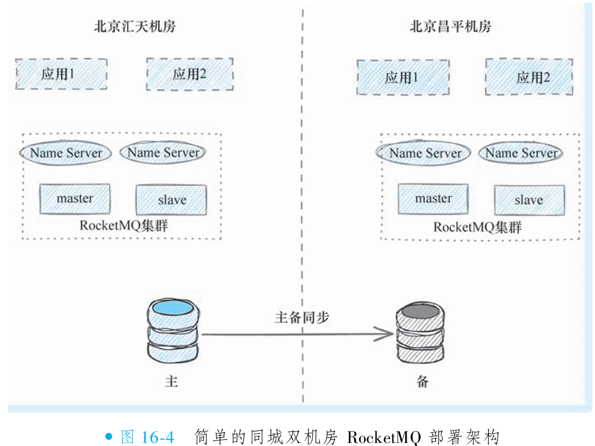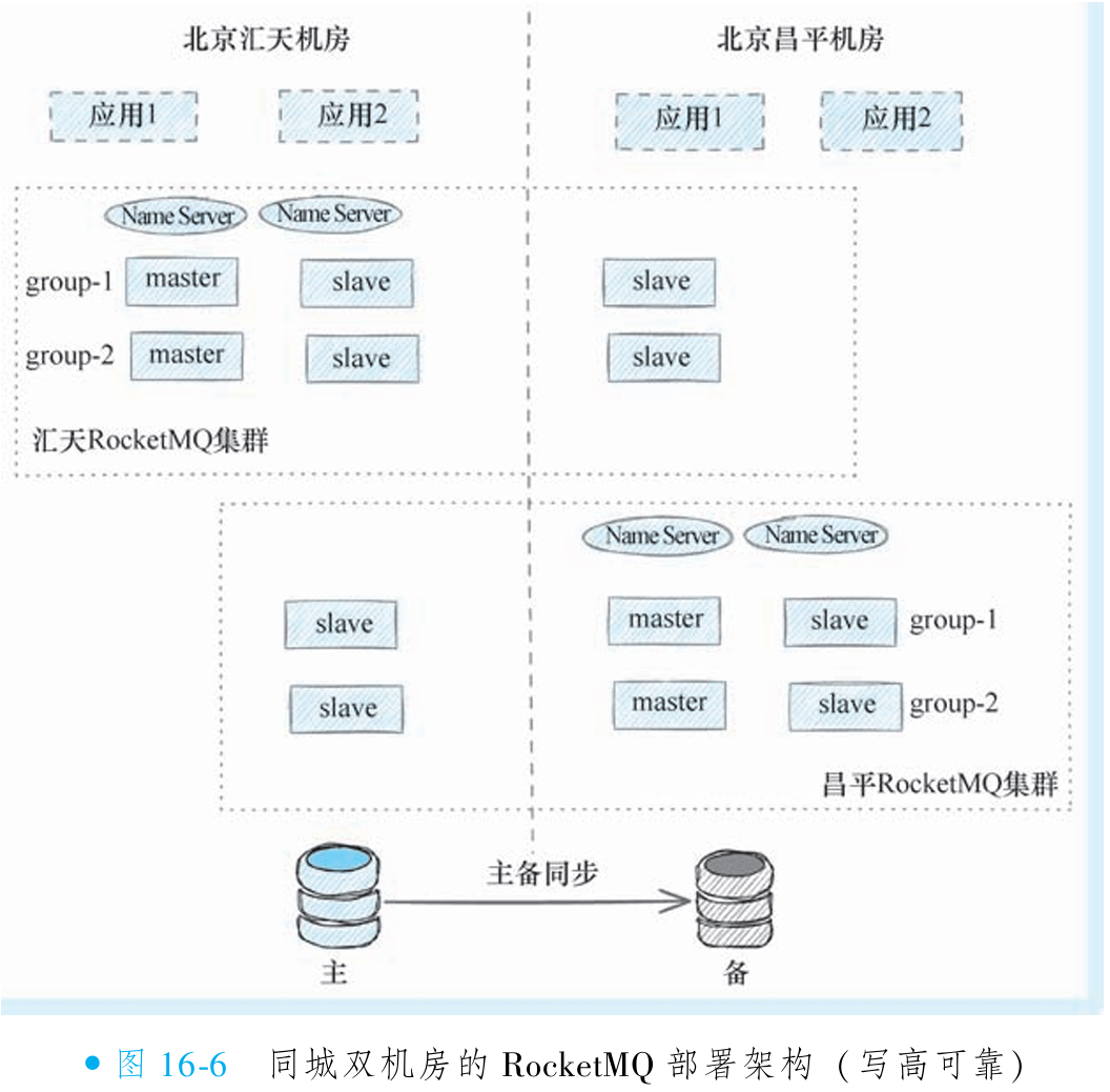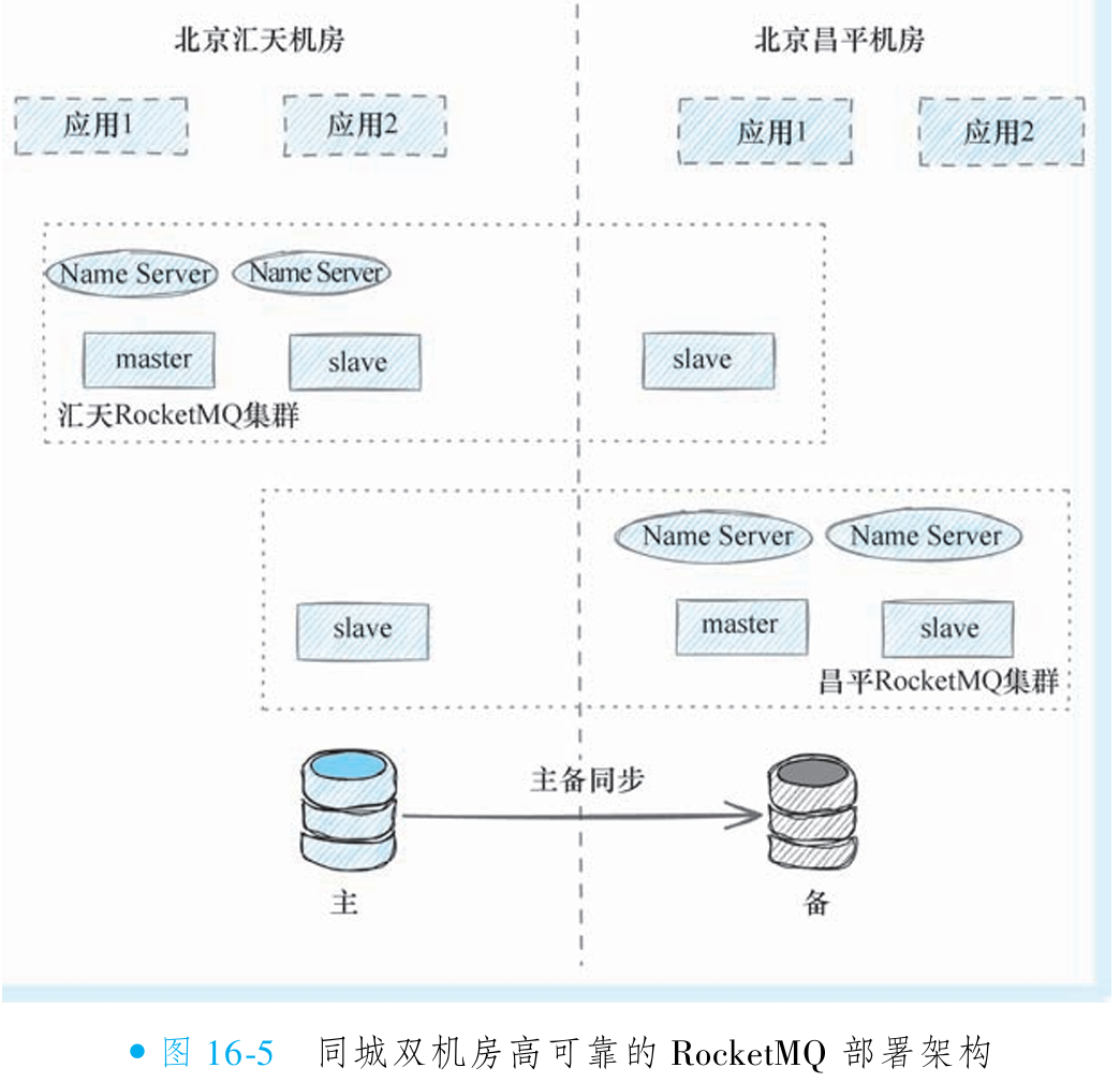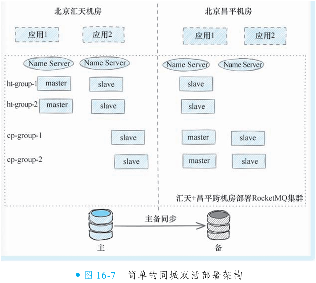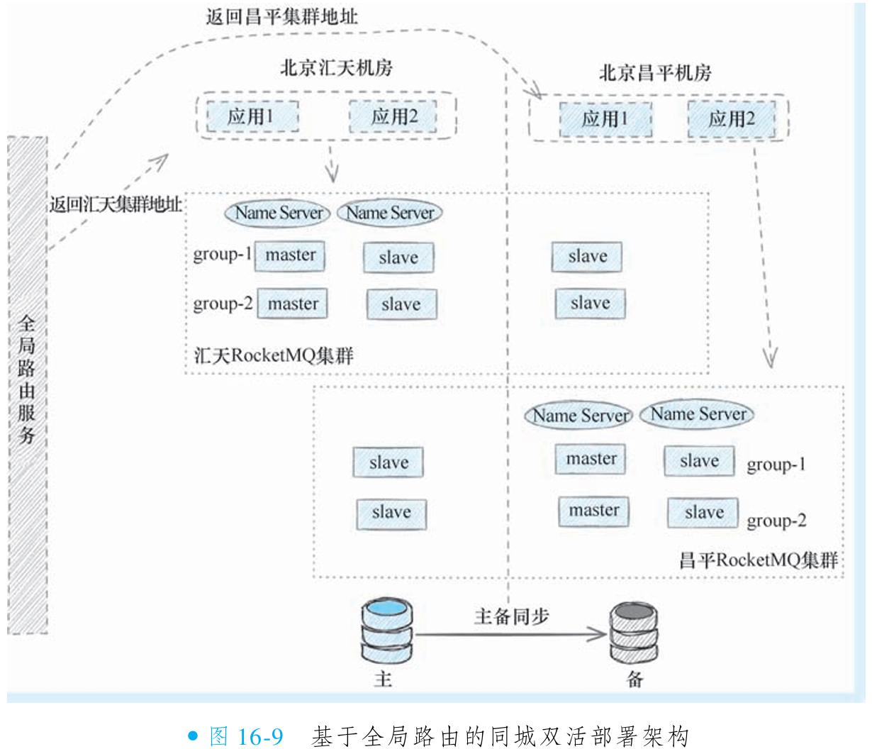 在如图16-10所示的架构切换场景中,若将消费压力全量导向昌平机房,需确保其容量足以承载两机房流量,否则需同步切换消费者。切换时,全局路由服务将下发昌平机房Name Server地址,汇天机房消费者据此新建连接至新集群,实现消息流重构:汇天生产者投递至昌平MQ集群,双机房消费者共同分摊消费(如图16-11)。