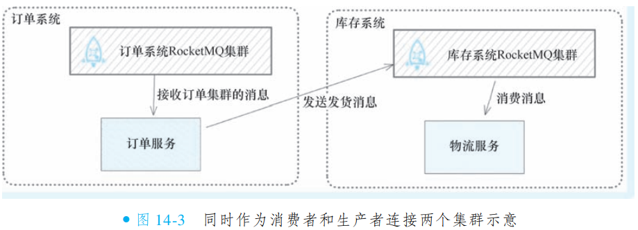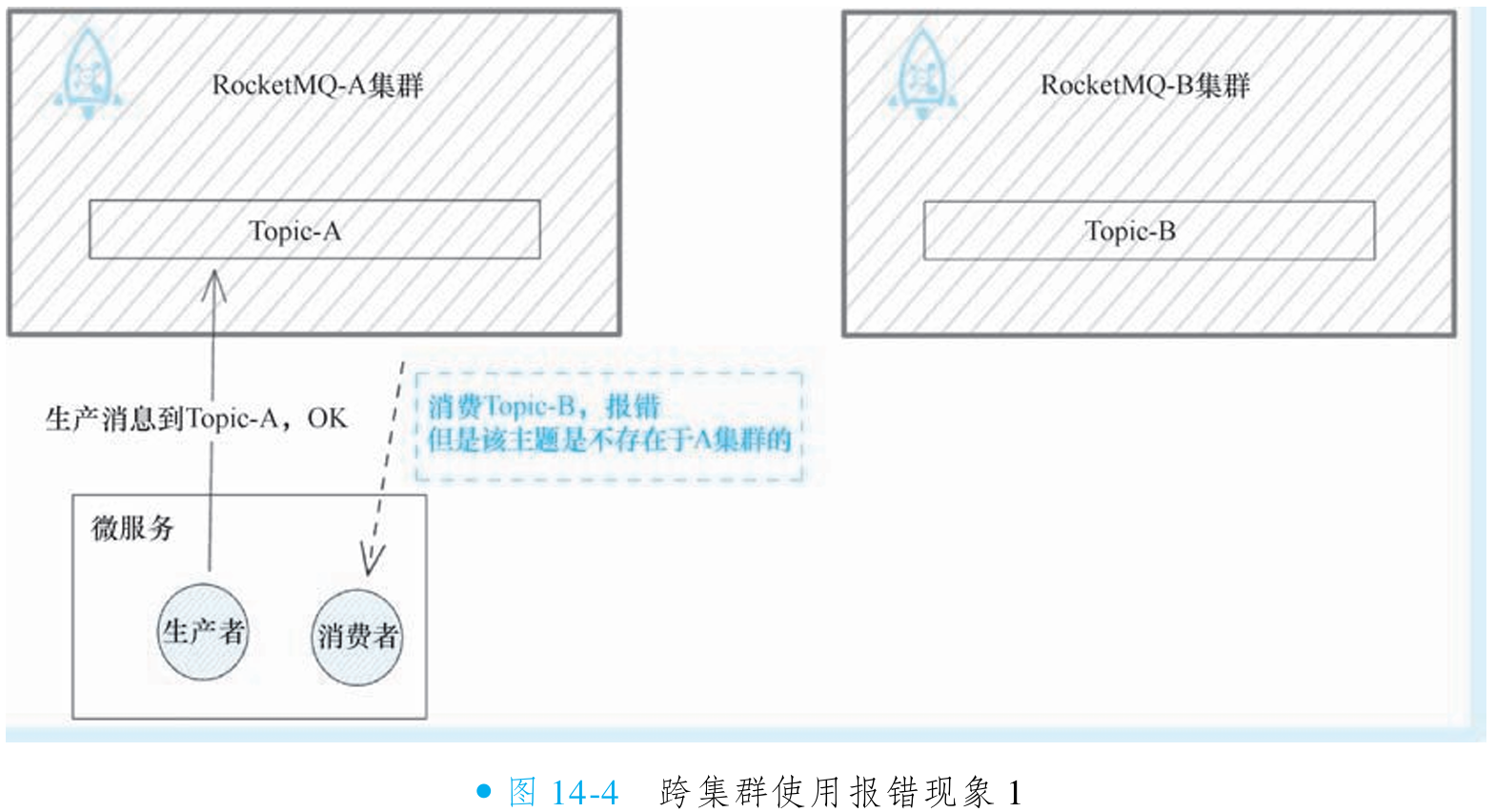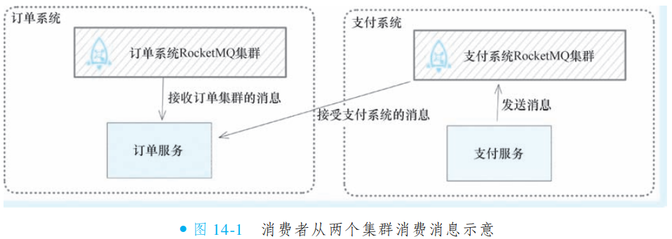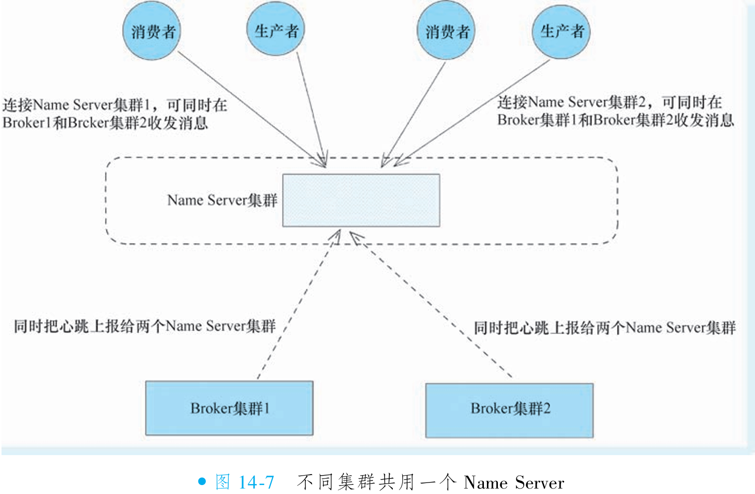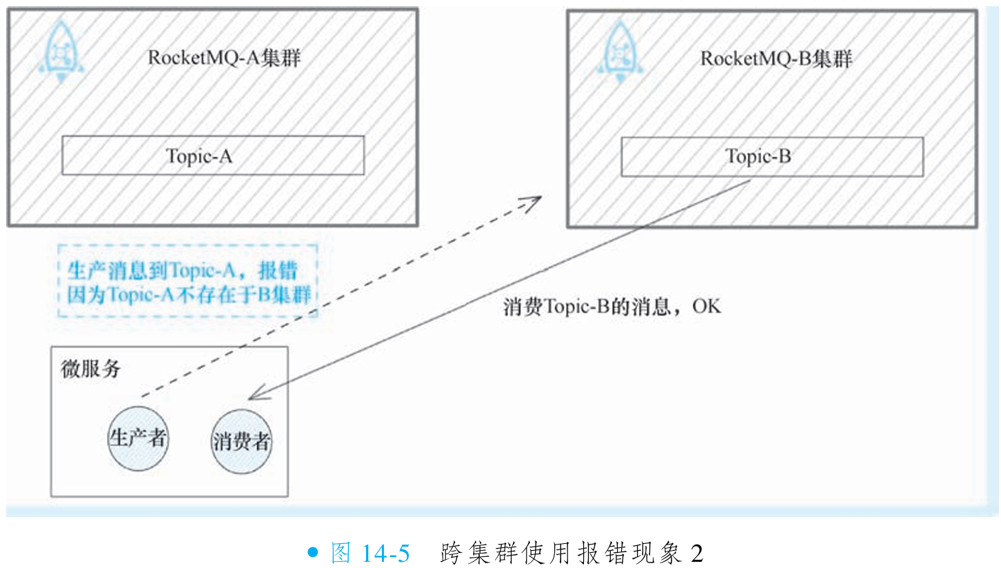 在如图16-10所示的架构切换场景中,若将消费压力全量导向昌平机房,需确保其容量足以承载两机房流量,否则需同步切换消费者。切换时,全局路由服务将下发昌平机房Name Server地址,汇天机房消费者据此新建连接至新集群,实现消息流重构:汇天生产者投递至昌平MQ集群,双机房消费者共同分摊消费(如图16-11)。